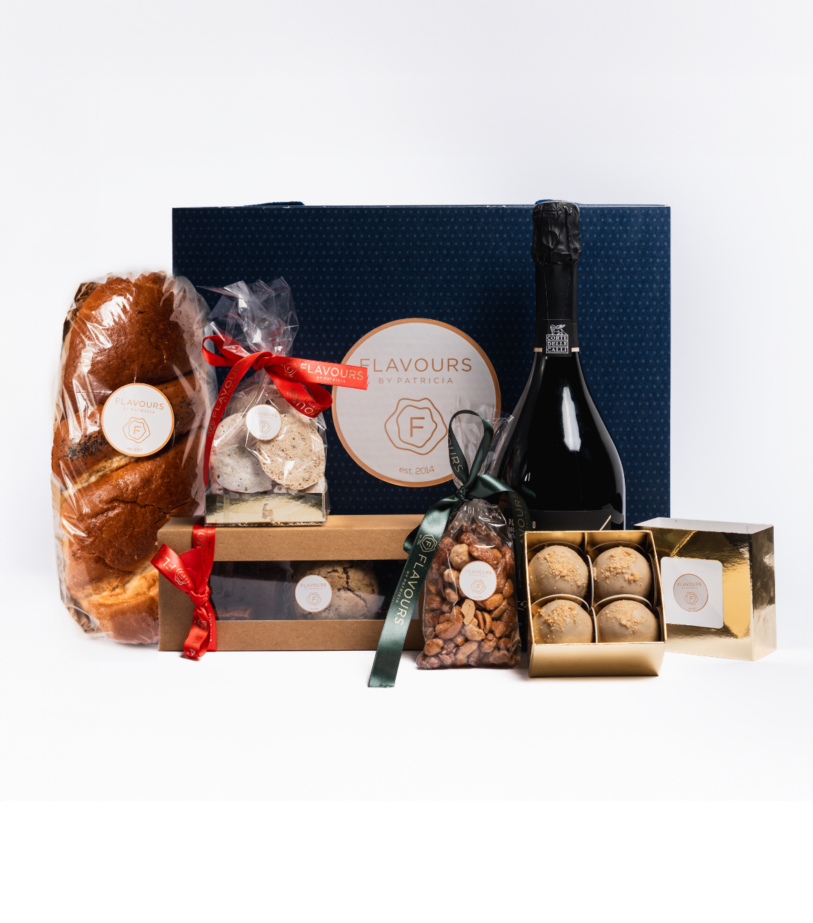 cozonac cu mac/nucã, bezele cu nucã, mix fursecuri, ciocolatã de casã, mix alune glazurate, cakepops cu arahide, prosseco Doc Delle Cali, cutie cadou-2250 gr