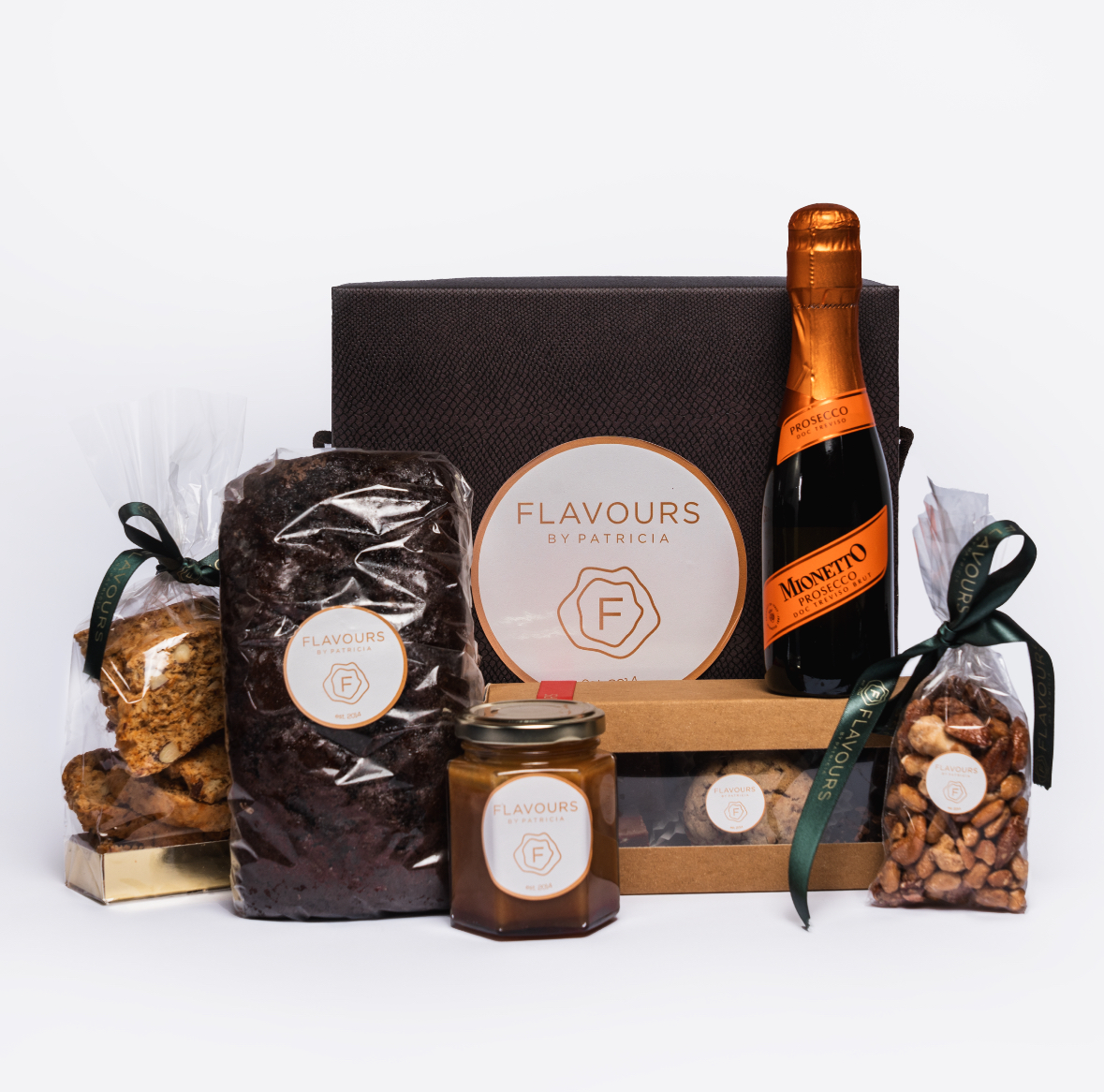 cozonac cu mac/nucă sau chec turtă dulce, biscotti cu rosii uscate si rozmarin, caramel de casã, mix fursecuri, ciocolatã de casã, mix alune glazurate, proseco Mionetto, cutie cadou-1200 gr